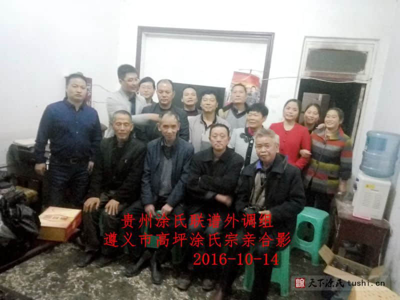 贵州涂氏宗亲联谱联络组涂融、涂仁伟、涂在良、涂志刚、涂云勇、涂达富一行六人,于2016年10月14日下午到达贵州省遵义市汇川区高坪办事处街上,受到高坪涂小毛等宗亲的热情接待,与高坪涂氏宗亲涂小毛、涂祥银、涂林华、涂文林、涂彩林、涂祥金、涂祥华、涂祥久座谈,常务副会长涂融向高坪涂氏宗亲介绍了贵州涂氏宗亲理事会于2014年五一成立以来三年所做的工作,从2015年11月1日在六盘水月照金钟召开“贵州涂氏宗亲联谱”筹备会后,理事会对贵州涂氏联谱做了大量工作,已搜集了部分宗亲资料。名誉会长涂在良讲编修中华涂氏大宗谱和贵州涂氏联谱的目的和意义,高坪涂小毛发言,高坪涂氏现有三百户人,从高坪迁出的晴隆有几十户、云南曲靖有一百多户,祖辈口传我们是刘姓改涂姓,从江西迁来,没有文字记载,没有老谱书,高坪涂氏族人欢迎联络组到高坪联络贵州涂氏联谱,希望贵州涂氏宗亲理事会将贵州涂氏抱成一团,早日完成贵州涂氏联谱。