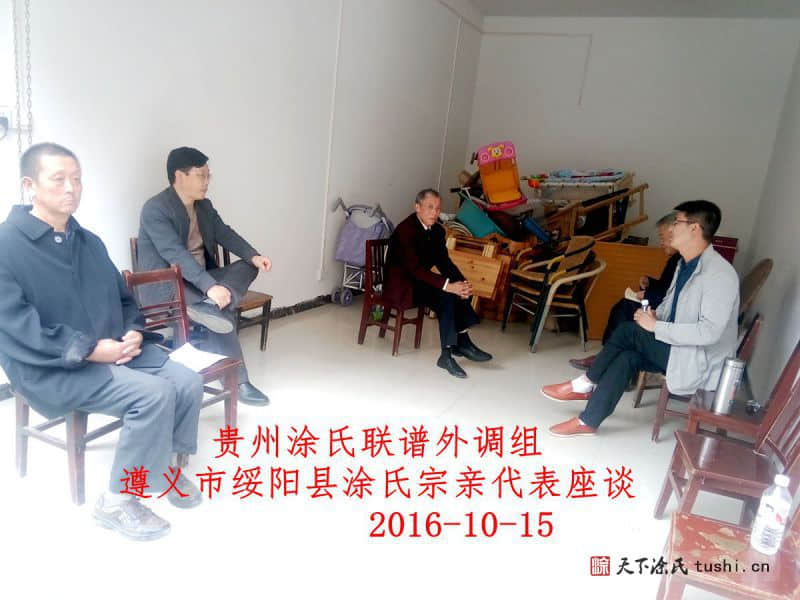 贵州涂氏宗亲联谱联络组涂融、涂仁伟、涂在良、涂志刚、涂云勇一行五人,于2016年10月15日上午到达贵州省遵义市绥阳县城,与绥阳县涂氏宗亲代表涂文志座谈,常务副会长涂融介绍了贵州涂氏宗亲理事会成立三年来所做的工作和贵州涂氏联谱事宜,涂在良讲了搜集宗亲资料要求。涂文志讲绥阳县现有涂姓二百多户人,分散居住,没有老族谱,由于文化有限至今没有族谱资料,我代表绥阳县宗亲支持贵州涂氏联谱,尽力将绥阳县族谱资料搜集齐全,与贵州省涂氏联宗联谱。