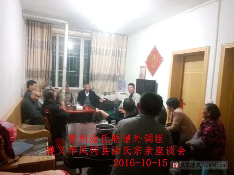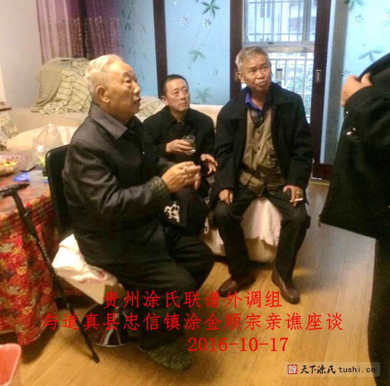 贵州涂氏宗亲联谱联络组一行五人,于2016年10月15日下午到达贵州省遵义市风冈县城,风冈县涂松、丁江林宗亲热情接待,饭后到风冈县城苏家湾小区丁文贵宗亲家里,与风冈县涂氏宗亲丁文件贵、涂松、涂孝军、丁江林宗亲座谈,常务副会长涂融介绍了贵州涂氏宗亲理事会于2014年五一成立来三年所做的工,从2015年11月1日在六盘水月照金钟召开贵州涂氏宗亲联谱筹备会后,理事会对贵州涂氏联谱做了大量工作,已搜集了部分宗亲资料。名誉会长涂在良讲编修中华涂氏大宗谱主贵州涂氏联谱的目的和意义,丁文贵(78岁)老宗亲讲,贵州涂氏宗亲会的做法符合当前形势,统一字辈(派)已概括清楚,没有经费为难你们了,我的祖父从正安县与道真交界处安场搬迁到风冈,祖辈口传由于我们姓涂的少就过继丁家姓丁,丁姓还说我们本不是姓丁,不要长期跟他们姓丁,听到这个传说我心里真难过,我三十年前就决定退休后拟谱归宗涂姓,由于儿子高残不能脱身去做,没能如愿,今天贵州宗亲会来做贵州涂氏联谱,我只能在心中赞扬你们了,你们宗亲会所做的事会感动贵州所有涂姓子孙的。涂松、丁江林、涂孝军介绍风冈涂姓宗亲来自五个不同支系,很团结,有二百多户人,以前我们不知有贵州涂氏宗亲会,现在你们来作了介绍,我们会全力支持,贵州涂氏宗理事会早日完成贵州涂氏联谱。