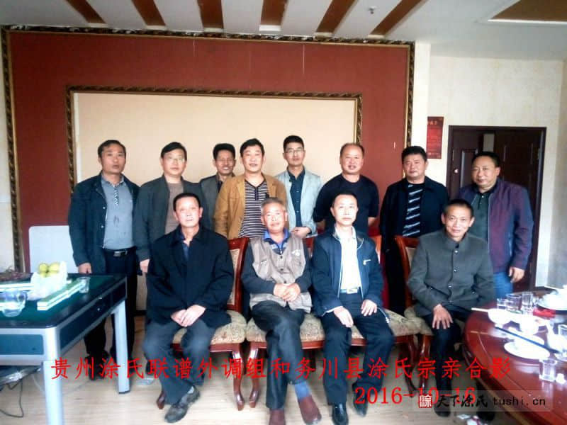 贵州涂氏宗亲联谱联络组一行五人,于2016年10月16日中午到达贵州省遵义市务川县城,受到务川县涂金杰、涂森、涂杰、涂修武、涂胜利、涂代坤、涂代顺等宗亲的热情接待,常务副会长涂融向务川县宗亲通报了贵州涂氏宗亲理事成立三年来所做的工作,六盘水月照金钟召开贵州涂氏宗亲联谱筹备会后,理事会对贵州涂氏联谱做了大量工作,已搜集了部分宗亲资料。名誉会长涂在良讲编修中华涂氏大宗谱和贵州涂氏联谱的目的和意义,务川县涂氏宗亲会会长涂金杰宗亲,介绍务川县涂氏宗亲来自四个不同支系二百多户人,居住在都濡街道鹿坪村、高桥、分水镇、黄都镇丝棉村、县城几个地方,我们务川涂氏宗亲在前几年就成立了务川涂氏宗亲会,涂氏宗亲不分哪户人家有红白喜事,务川涂氏宗亲会都要到场悼念和祝贺,我们4个支系都没有族谱资料,我的祖辈口传是从江西南昌迁来,从印江到务川县居住,我们四个支系的族人很团结, 以前我们不知有贵州涂氏宗亲会,今年听说了贵州涂氏宗亲会,现在你们来作了介绍,我们会全力支持,贵州涂氏宗理事会早日完成贵州涂氏联谱。务川涂氏宗亲涂森、涂杰、涂修武、涂胜利、涂代坤、涂代顺等作了激情洋溢的发言。