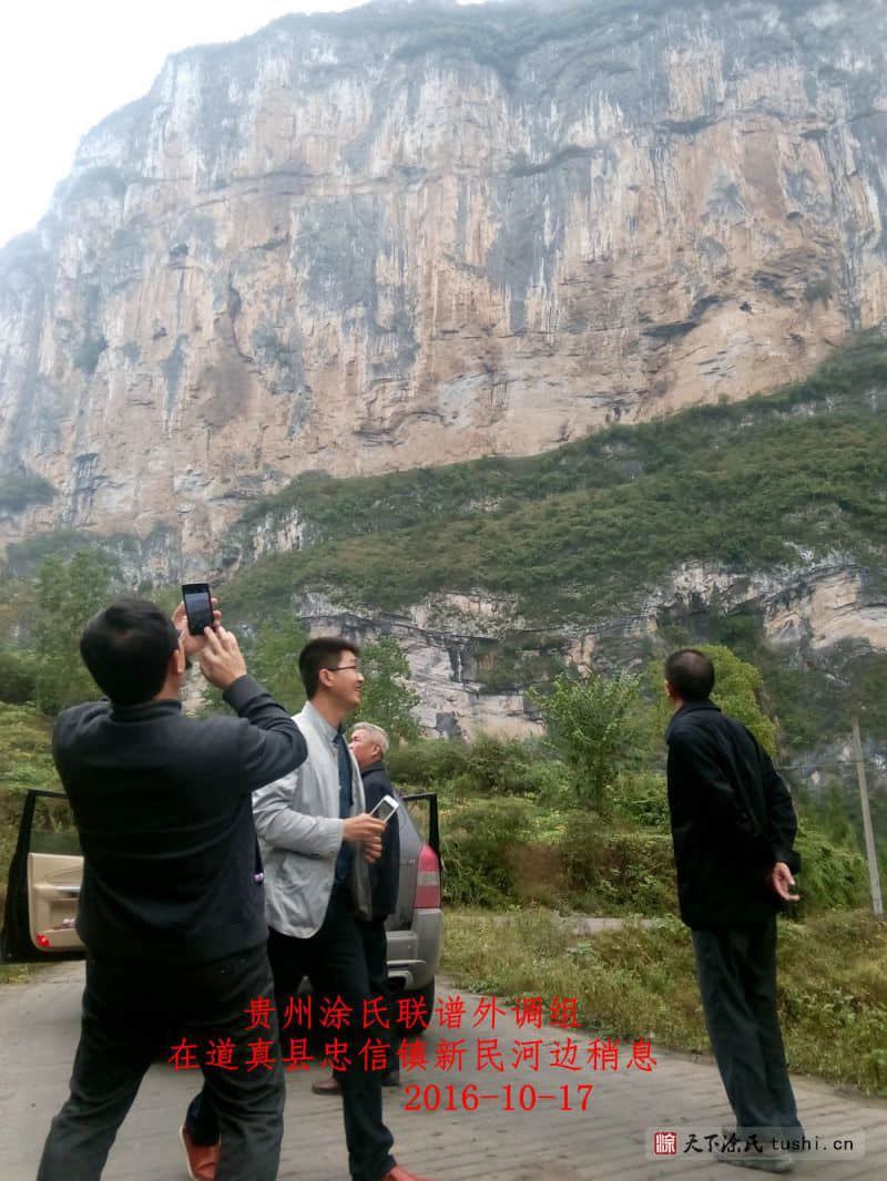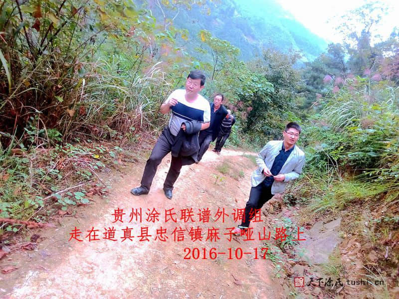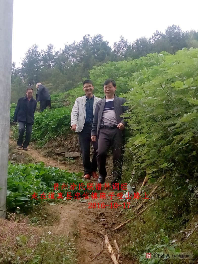 贵州涂氏宗亲联谱联络组一行五人,于2016年10月16日下午17时道别务川县涂氏宗亲,天黑赶到贵州省遵义市道真县城,在道真县城东街涂家副食品店店主涂孝均打访到道真县城居住有涂姓二、三十户人,知道族谱根源的涂孝青到都匀去了,道真县忠信镇新民村涂姓人二百多户,第二天早上赶到忠信镇新民村麻子哑涂加林家,涂加林家属介绍对河两面居住涂姓八大房后人二百多三百户,没有谱书,由涂金顺拟谱还没有出书,经电话联系涂金顺在遵义,外调组一行下午18时赶到遵义市成都路与涂金顺见面,涂融简短说明来意后,听介绍后,78岁的涂金顺宗亲说他们从江西到川南转道真县忠信镇新民村,有八大房后人三百多户,有一支去正安县失去联系,有两支去向不明,由于没有老谱书,前几年修了忠信新谱手稿未出书,你们统修贵州涂氏联谱这件事,我非常支持你们,十天后回道真县将族谱手稿寄到涂氏宗亲理事会资料组,经简短交流后,外调组道别涂金顺宗亲返程。