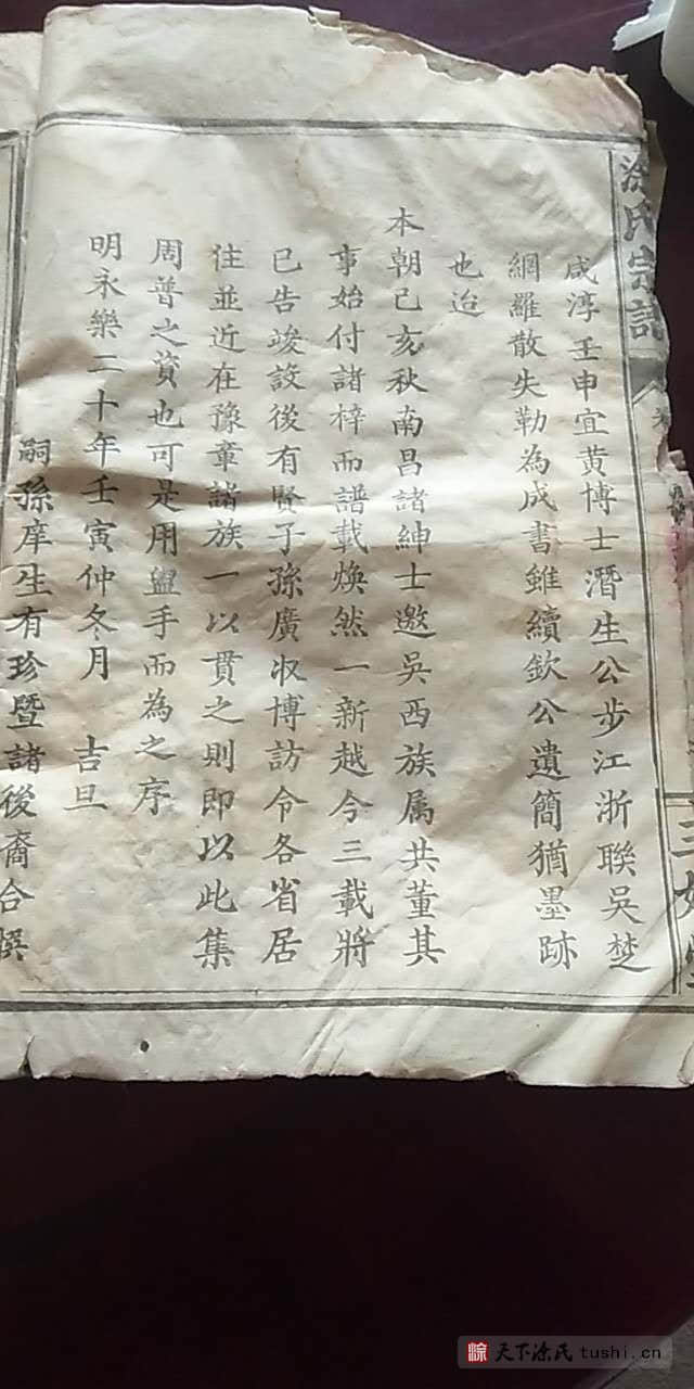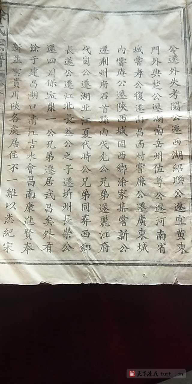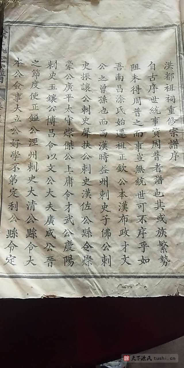 如吾南昌涂氏始迁祖正钦公,本汉布政(使),才文公之曾孙也。而西汉时,益州刺史子佛公;刺史振让公;刺史声扶公;刺史汉佐公;县令灿豪公;广平太守灿杰公;上庸令才武公:庆阳刺史玉镶公;博昌令以文公;大夫广成公。晋之节度使正镒公;泾州剌吏大清公;县令大本公;佥事大立公;好学不第定利公;县令定宗公:唐时刺史廙公;刺史金印公;宋之举人文海公;元祐之政大经公;庠生佐宋公;庠生蒸纶公;进士傅寰公;庠生万鹤公;元之举人代崙公,皆其伯叔之祖裔也。但正钦公因渡江南至豫章,落业羡其地,正人淳钟麓鼎峙大洲远列,遂树家于此,四邻称之咸曰:“涂家湾”是也。公之前纷迁古牒备载,故不瓒录。公之后有定缙公复迁山阴,道宗公迁武宁,荣升公南宋明帝五年迁武宁。岐公迁兴化;观公迁失考。阅公迁西湖;绍联公迁宜黄东门外;兴楚公迁湖南岳州;佐尊公迁河南省城;尝孝公复迁南昌西村;尝廉公迁广东城内;尝庵公迁陕西城固西乡涂家集;尝新公迁荆州府石首县内。代先公兄弟迁丽江府。代岗公迁湖北江夏,代时公兄弟同葬西乡。长遂公迁江北;长益公之子迁圻州;长荣公迁四川保宁;鼎一公兄弟迁居武昌矣!外有余于建昌湖口、清江、吉水、会昌、南康、进贤、奉新,并云、贵、川、陕各处居住不一。虽以悉纪,宋咸淳壬申宜黄博士溍生公,步江浙联吴之纲,羅散失勒为成书,虽续钦公遗简,犹墨跡也。迨本朝己亥秋,南昌诸绅士邀吴西族属,共董其事,始付诸梓而谱载,焕然一新,越今三载,将已告竣。设后有贤子孙,广收博访,令(今) 各省居住並近在豫章诸族,一以贯之则即以此集周普之资也。可是用洗手而为之序。