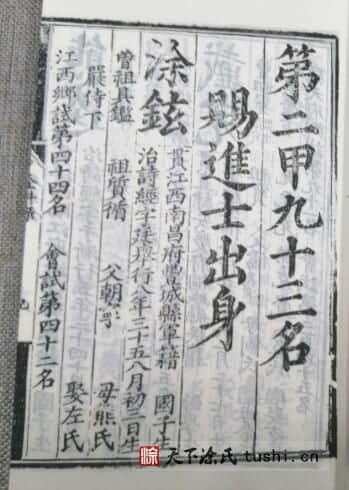 大哥,你突兀的弄战图出来知道会引起多大误会吗?你们家谱里记载的是,嘉靖二十三年进士殿试二甲第一名!那图片上的“第二甲九十三名”怎么解释?涂铉堪称涂氏科举第二人!第一甲为“赐进士及第”,是状元、榜眼、探花。第二甲共有93名,涂铉公位列第一,也就是那年科举他是第四名! 还有“严侍下”什么意思?就是丧母。
