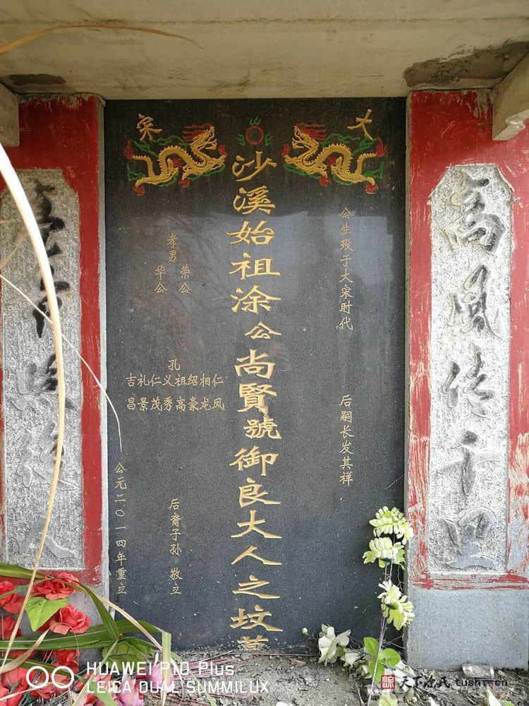 由于年代久远,原来的石碑风化得厉害,上面的碑文大多模糊不清,只能勉强分辨出“大宋”与墓主人名及尚贤公墓最早修建人“荣”、“华”等字样,但年份等其他字迹已无法辨认。左下方是尚贤墓二修后代孔字辈八位前辈的名。现在我们看到的这尊墓是2014年沙溪涂氏第三次重修的。 尚贤公墓高高耸立着,正面遥望着不远千里寻觅到的风水宝地,仿佛就像尚贤公当年那样金戈铁马勒缰伫立,他是在庇护着他的子子孙孙平安富足!