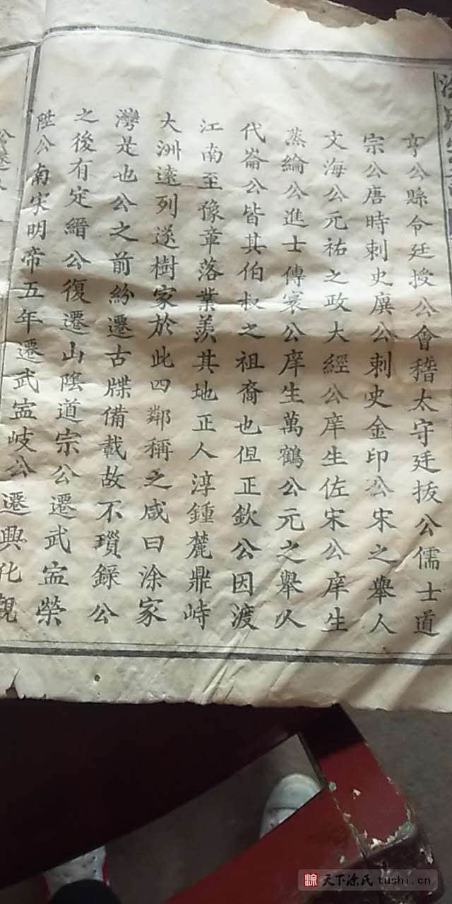 如吾南昌涂氏始迁祖正钦公,本汉布政(使),才文公之曾孙也。而西汉时,益州刺史子佛公;刺史振让公;刺史声扶公;刺史汉佐公;县令灿豪公;广平太守灿杰公;上庸令才武公:庆阳刺史玉镶公;博昌令以文公;大夫广成公。晋之节度使正镒公;泾州剌吏大清公;县令大本公;佥事大立公;好学不第定利公;县令定宗公:唐时刺史廙公;刺史金印公;宋之举人文海公;元祐之政大经公;庠生佐宋公;庠生蒸纶公;进士傅寰公;庠生万鹤公;元之举人代崙公,皆其伯叔之祖裔也。但正钦公因渡江南至豫章,落业羡其地,正人淳钟麓鼎峙大洲远列,遂树家于此,四邻称之咸曰:“涂家湾”是也。公之前纷迁古牒备载,故不瓒录。公之后有定缙公复迁山阴,道宗公迁武宁,荣升公南宋明帝五年迁武宁。岐公迁兴化;观公迁失考。阅公迁西湖;绍联公迁宜黄东门外;兴楚公迁湖南岳州;佐尊公迁河南省城;尝孝公复迁南昌西村;尝廉公迁广东城内;尝庵公迁陕西城固西乡涂家集;尝新公迁荆州府石首县内。代先公兄弟迁丽江府。代岗公迁湖北江夏,代时公兄弟同葬西乡。长遂公迁江北;长益公之子迁圻州;长荣公迁四川保宁;鼎一公兄弟迁居武昌矣!外有余于建昌湖口、清江、吉水、会昌、南康、进贤、奉新,并云、贵、川、陕各处居住不一。虽以悉纪,宋咸淳壬申宜黄博士溍生公,步江浙联吴之纲,羅散失勒为成书,虽续钦公遗简,犹墨跡也。迨本朝己亥秋,南昌诸绅士邀吴西族属,共董其事,始付诸梓而谱载,焕然一新,越今三载,将已告竣。设后有贤子孙,广收博访,令(今) 各省居住並近在豫章诸族,一以贯之则即以此集周普之资也。可是用洗手而为之序。